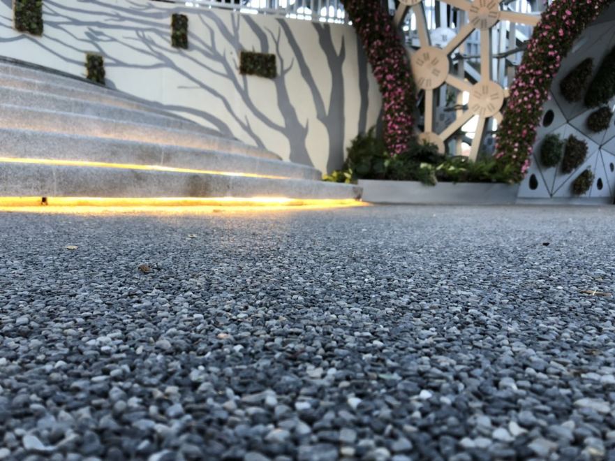 膠粘石路面高分子為膠結(jié)粘合劑材料,將天然彩石、拋光色石、玻璃、水晶石、人造再生骨料等牢固地粘接在一起,鋪設(shè)在混凝土、透水混凝土、瀝青或級(jí)配砂石基層上的生態(tài)景觀地面鋪設(shè)材料,具有透水、自然美觀、色彩多樣、經(jīng)久耐用等特點(diǎn)。